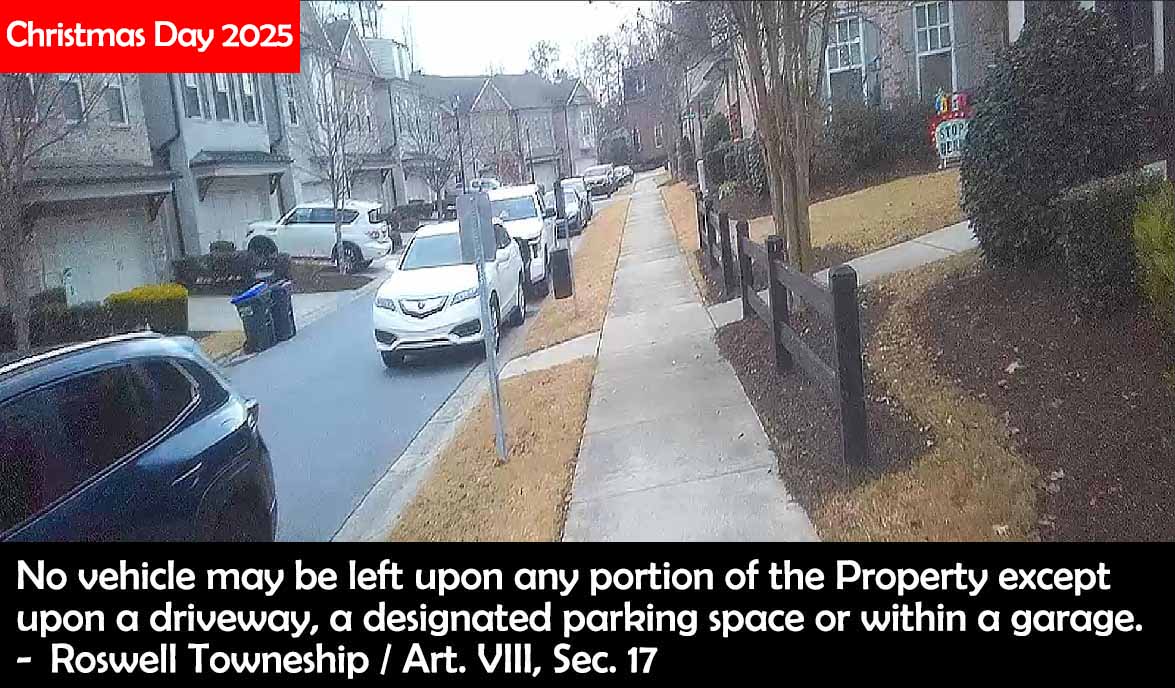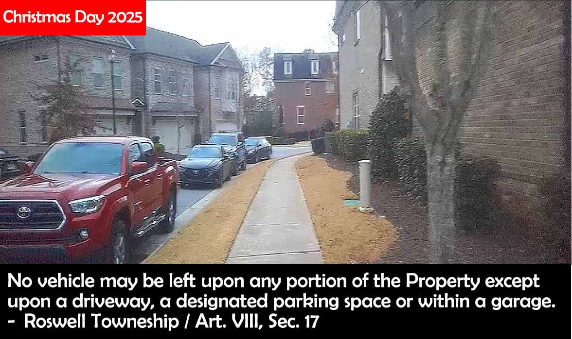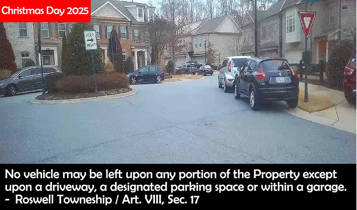Christmas Day should have been a day when Roswell Towneship looked its best. A time to celebrate with friends and family in a gorgeous, impeccably maintained, and safe HOA. Instead, it was nuts. Fucking nuts! It's a miracle a small child was not run over because of all of the obstructions in our streets. You could not look in a single direction and not see cars blocking the flow of traffic. A travesty. A disgrace. Insanity. It was fucking obscene. A total lack of leadership. Irresponsible people in charge. No one acting with any decency or ethics.