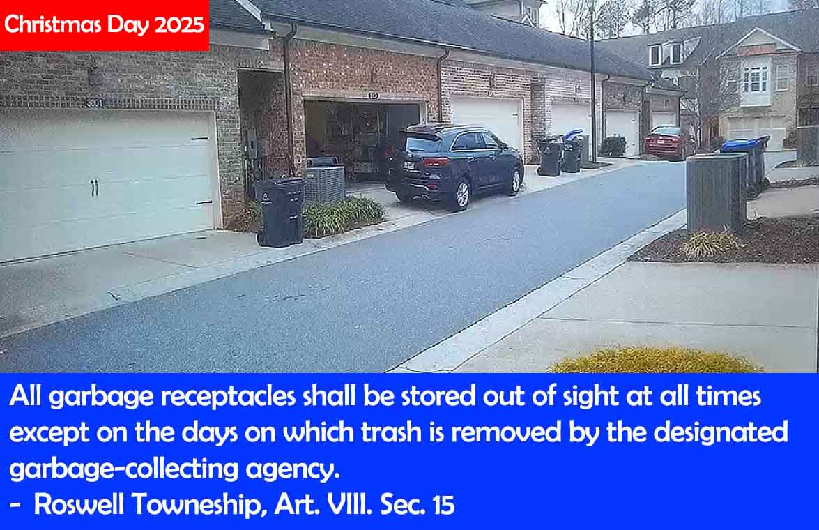 The first photo shows the same trash bin that I have been forced to look at every single day for the last eight months at 3012 Vickery Trace as I walk to and from my house. Clearly, this violates Art. 8, Sec. 15, but neither the Roswell Towneship BOD or the property manager Christina Gunn will do anything about it.